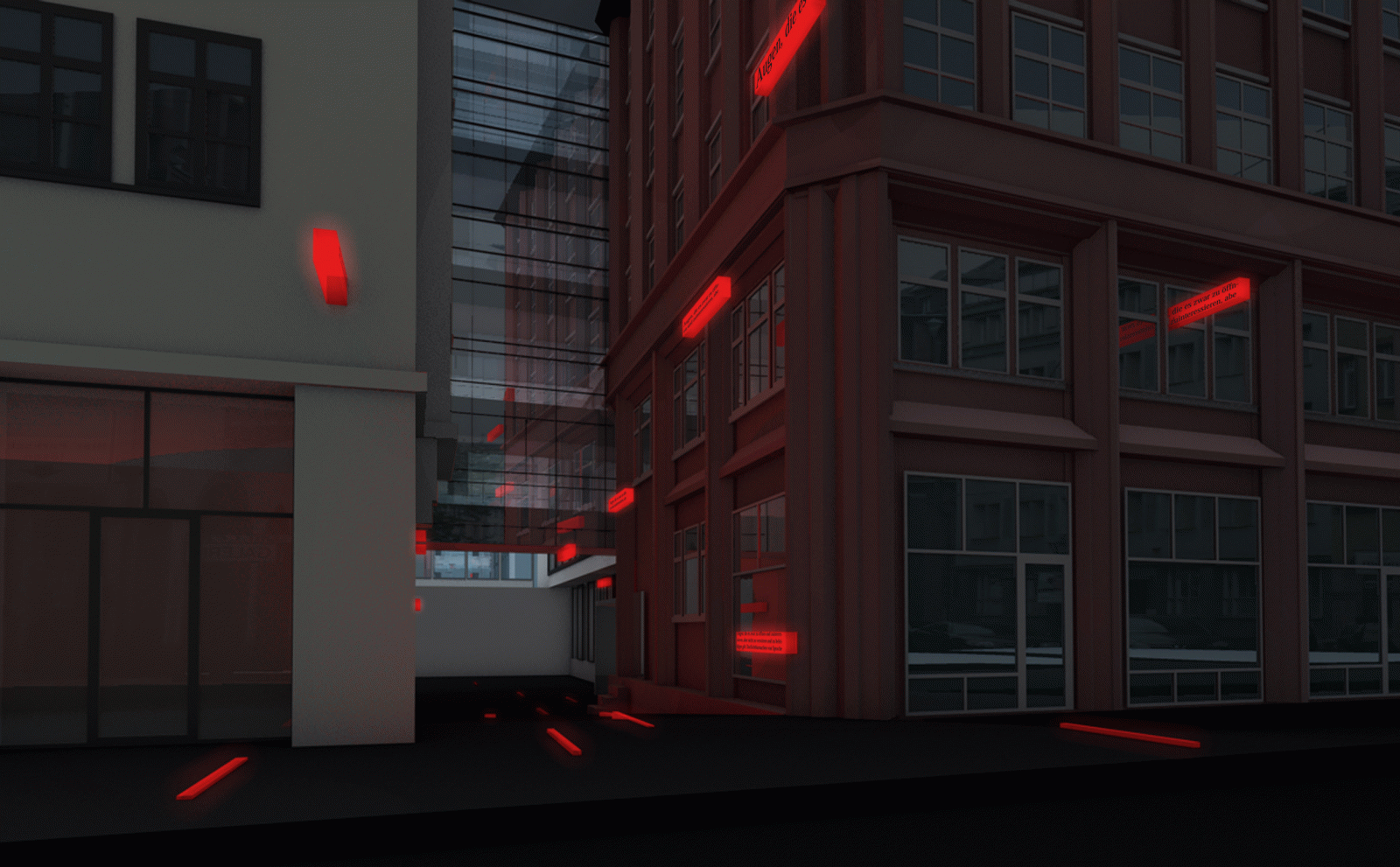 Rote selbstleuchtende Elemente tragen Worte und überlagern die Architektur im Aussen- und Innenbereich des Gebäudes.