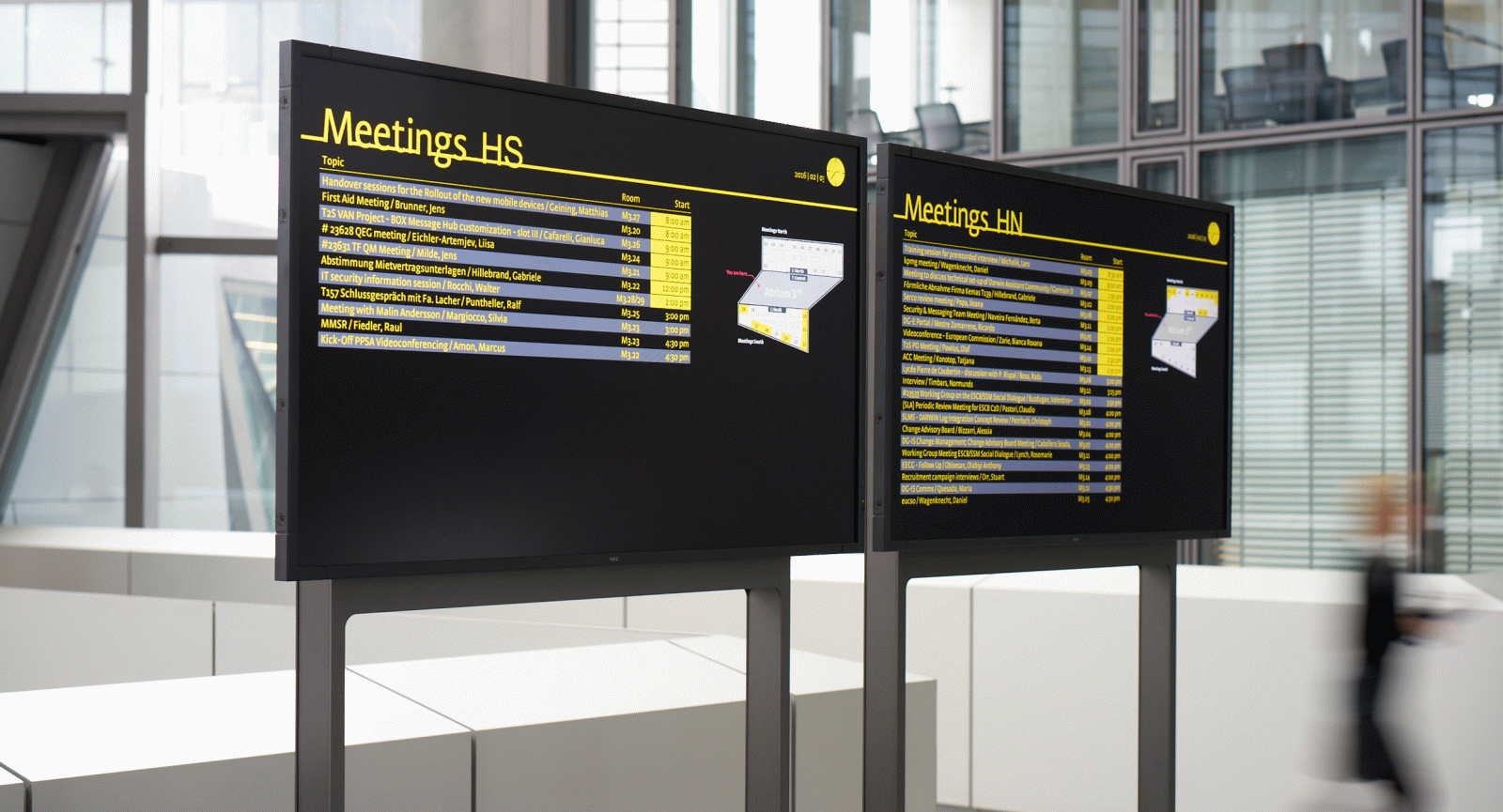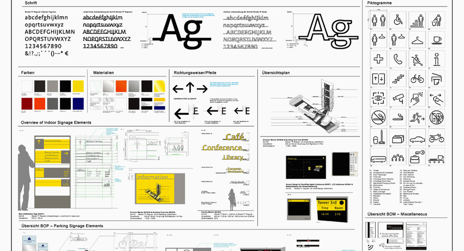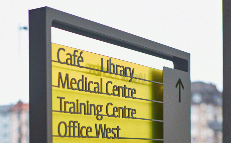 Mit seiner spektakulären Architektur und der gelungenen Integration von Martin Elsaessers historischer Grossmarkthalle setzt der von Coop Himmelb(l)au entworfene Hauptsitz der Europäischen Zentralbank eine Marke im Stadtbild von Frankfurt. Nach einem internationalen Auswahlverfahren wird unit-design 2007 mit der Gestaltung des Leit- und Informationssystems sowie der Markenrepräsentation im Innen- und Aussenraum der neuen EZB beauftragt. Neben der funktionalen Aufgabe, den Besuchern und Mitarbeitern intuitive Orientierung zu garantieren, ergänzt unser Entwurf die Architektur mit eigenständigen, präsenten Elementen. Scheinbar schwebende, dreidimensionale Schriftelemente erzielen trotz ihrer Transparenz starke Fernwirkung und verleihen den Einrichtungen wie Restaurant oder Konferenz eine Identität.