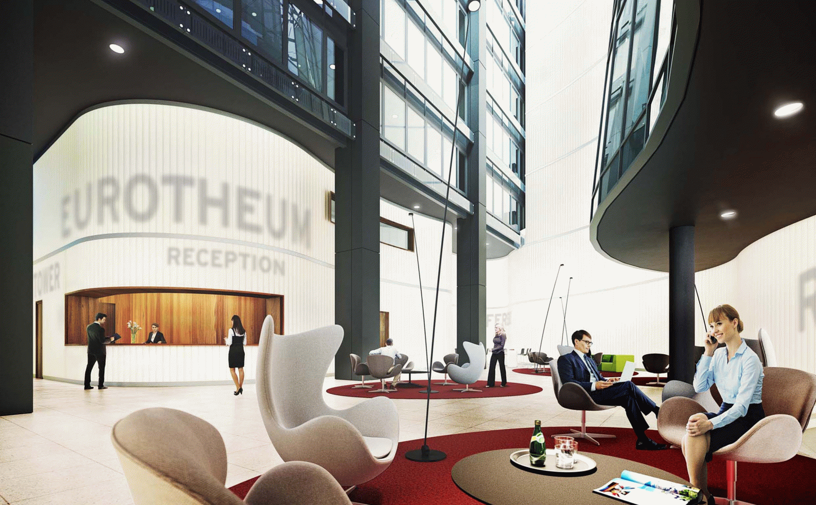 Der 1999 erbaute Büro- und Hotelkomplex Eurotheum in Frankfurt wird von Peter Kulka Architekten, Köln grundlegend überarbeitet. Ein grosszügig gestaltetes Foyer verbindet nun den alten und neuen Teil des Gebäudes. unit-design übernimmt die Entwicklung eines vollständigen Orientierungssystems, das die Kennzeichnung des Gebäudes im Aussenraum ebenso umfasst wie die des Foyers, der Büroetagen und der Tiefgarage.