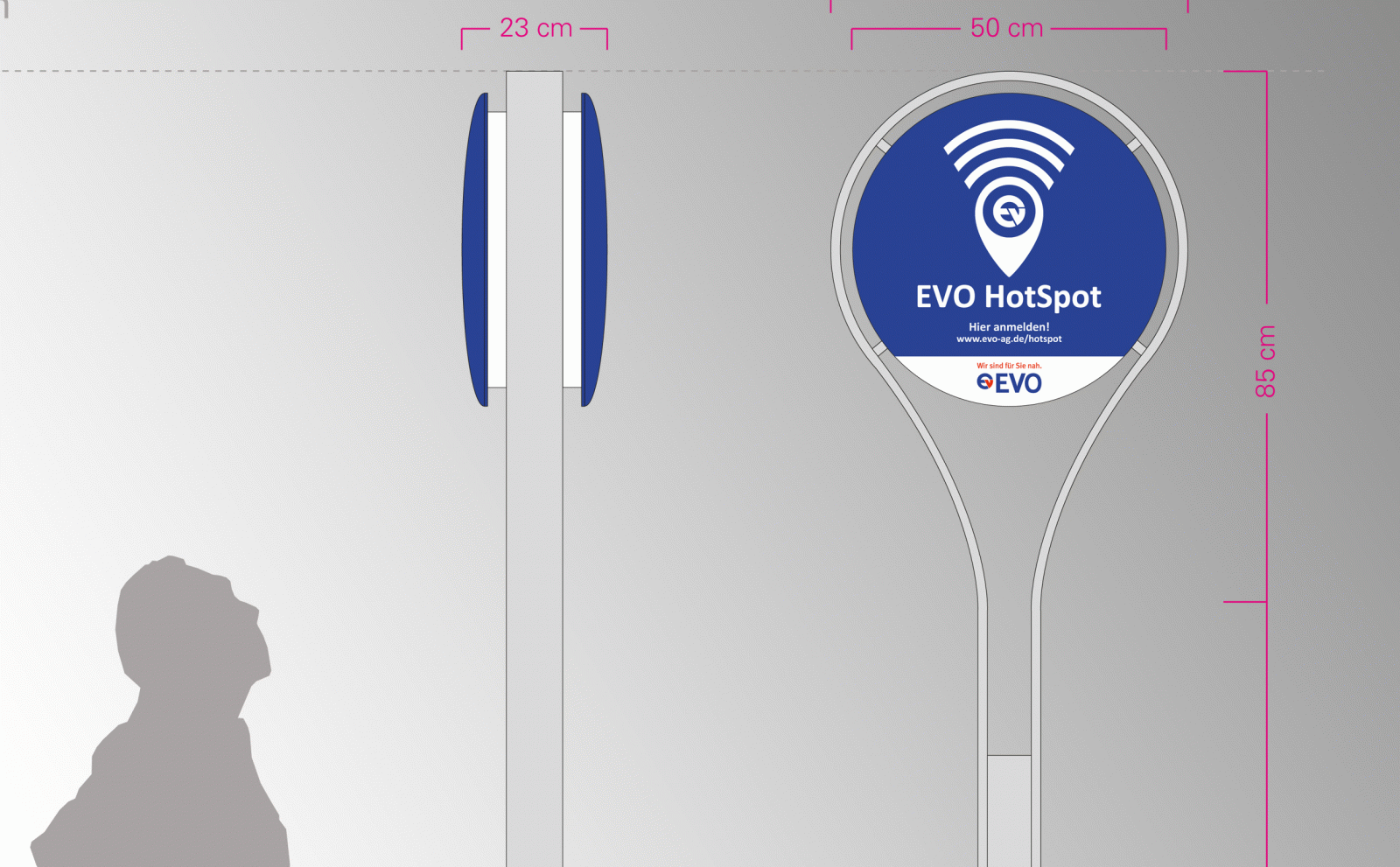 Die EVO-HotSpots sind ein Serviceangebot des Energieversorgers EVO aus Offenbach für seine Region. Zur Kennzeichnung dieser HotSpots entwickelt unit-design unterschiedliche Beschilderungstypen für variierende lokale Anforderungen. Charakteristische Gestaltungsmerkmale sind die technische Formensprache sowie die rahmenhafte Halterungskonstruktion, die ein integriertes und stabiles Gesamtbild bewirkt. So unterstützt das Design die Kommunikation von Qualitäts- und Innovationsanspruch.