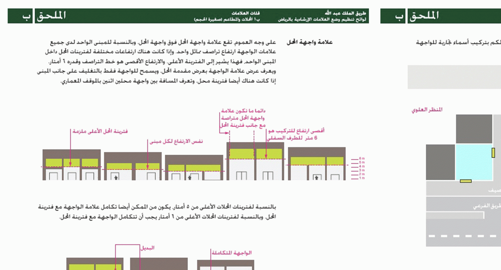 Die Stadtplanung von Riyadh beauftragt unit-design mit der Erarbeitung eines differenzierten Regelwerks, das die visuelle Qualität aller kommerzieller Werbe- und Kennzeichnungsmassnahmen entlang der 25 km langen Magistrale für zukünftige Bauprojekte regeln soll. Das entstandene Manual dient dazu, Gewerbetreibende entlang der Strasse zu motivieren, sich an einem qualitätvollen Erscheinungsbild zu beteiligen.