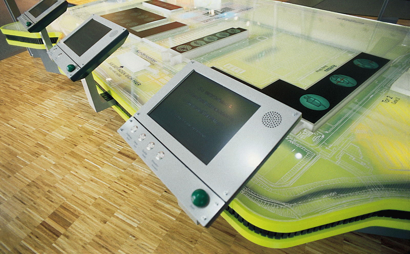 Ein multimediales Werksmodell visualisiert mit LED-Strecken und Leuchtkästen die Produktionsabläufe. An Terminals können Filme abgerufen werden, die die Produktionsschritte erläutern. An den Hörstelen berichten Mitarbeiter von ihrer Arbeit.