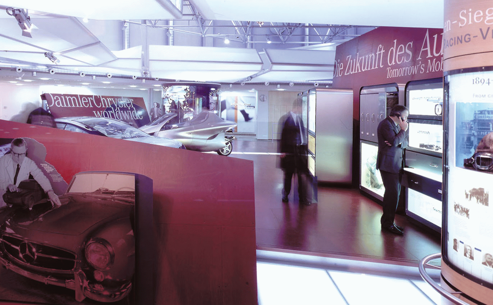 Durch die integrierte Gestaltung von Interieur, Ausstellungs-, Informationsdesign und Orientierungssystem gelingt es unit-design, ein eindrucksvolles Markenerlebnis in den Kundencentern von Mercedes-Benz in Sindelfingen, Rastatt und Bremen zu schaffen.