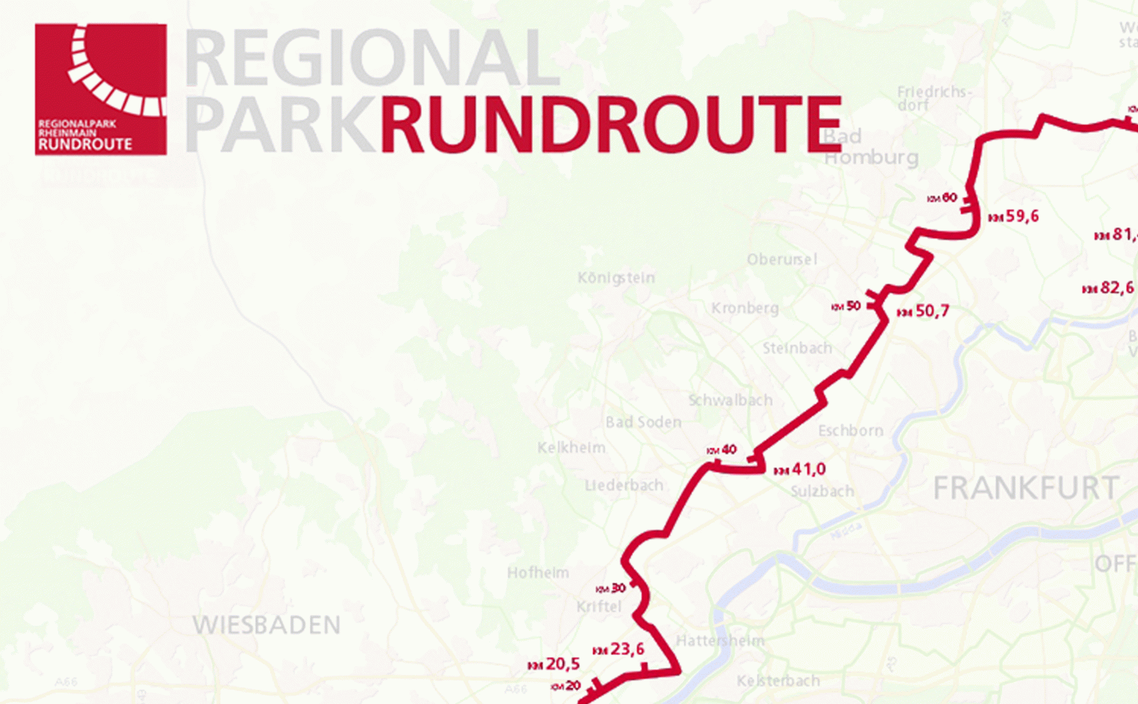 unit-design entwickelte das Kommunikationskonzept und die visuelle Identität der Rundroute und setzte die Gestaltung gemeinsam mit Gnüchtl Triebswetter Landschaftsarchitekten und Atelier Markgraph um. Die Idee war, beginnend an der Mainspitze, sozusagen dem 0-Punkt der Region, die gesamte Wegstrecke mit einer Kilometrierung zu vermassen. Vergleichbar mit den Kilometersteinen entlang der Flussläufe wird so jedem Ort auf der Rundroute eine konkrete und gut kommunizierbare Kennung gegeben, die innerhalb des Gesamtkonzeptes immer auch auf die anderen Orte verweist.