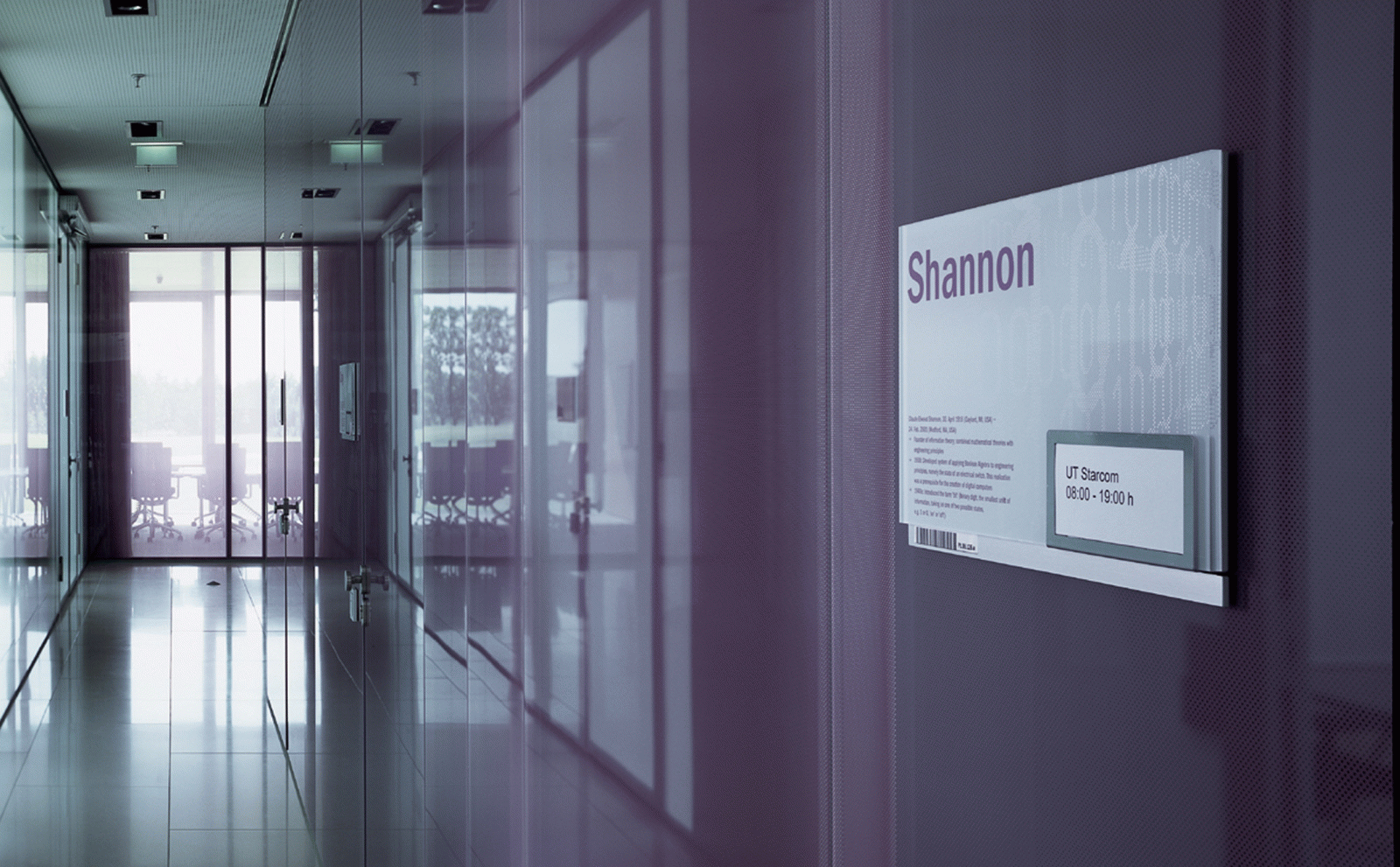 The headquarters of technology consulting firm Accenture, built in 2003, was the first in Germany to use a globally accessible booking system enabling employees to reserve open workspaces. The building signage that we developed is a functional response to these particular requirements. The office signs have fixtures where business cards can be placed, while the affixed barcodes enable them to be assigned to the booking software.