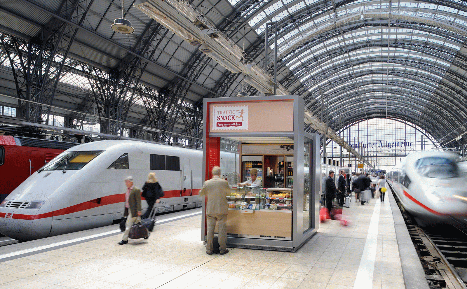 The finished object satisfies the rules on the protection of historic sites applicable to Frankfurt's station concourse and the desire for something that is recognizable and self-contained. The kiosk has been installed at numerous stations operated by Deutsche Bahn and received the prestigious Brunel Award for outstanding visual design in railway architecture, in Washington in 2011.