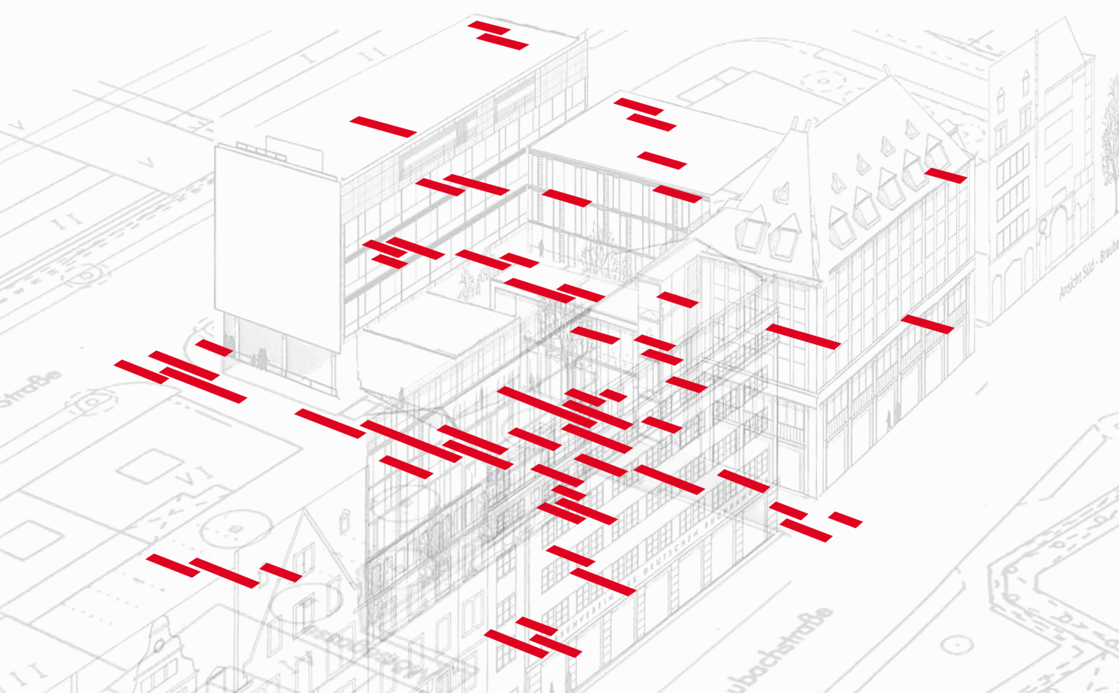 Mit der Modernisierung des Sitzes des Börsenvereins des deutschen Buchhandels in Frankfurt wird unit-design beauftragt, eine Intervention im Innenhof des Gebäudes zu entwickeln. In Zusammenarbeit mit dem Frankfurter Künstler Franz Mon entwickelt unit-design ein Konzept, das über beschriftete, an dreidimensionale Lesezeichen erinnernde Leuchtelemente einen ideellen Raum erzeugt, der den konkreten Raum überlagert.