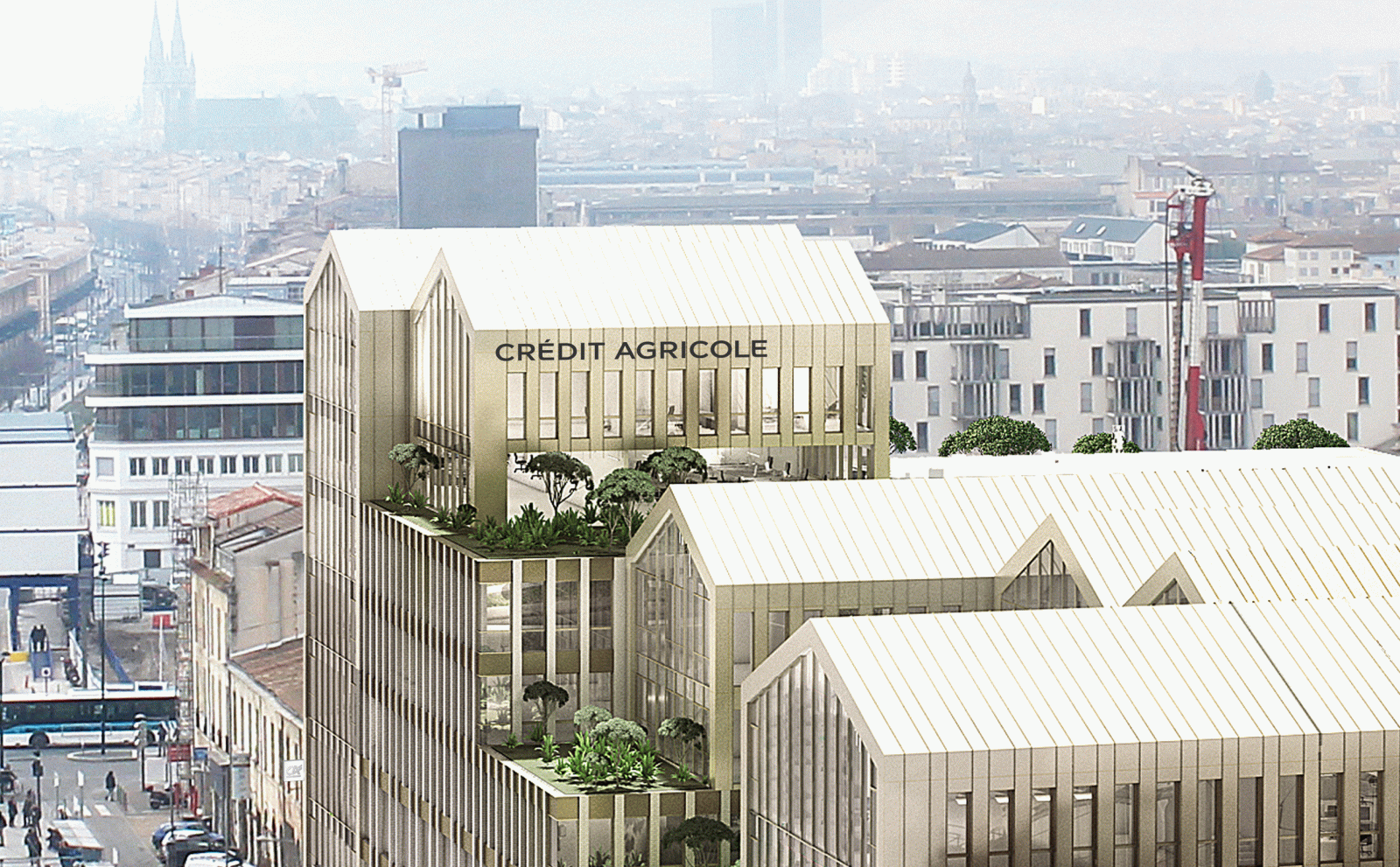 Die Crédit Agricole Aquitaine vertritt als Genossenschaftsbank vornehmlich die Winzer im Bordeaux-Gebiet. Bei der Wahl des Standortes für den neuen Unternehmenssitz fiel die Wahl auf die «bassins à flots», ein altes Hafenquartier innerhalb des UNESCO-Weltkulturerbe-Schutzradius, das aktuell zu einem dichten und lebendigen Stadtquartier entwickelt wird. Die Architektur von Wilmotte Architectes, Paris nimmt Bezug auf den Charakter von Lagerhallen und Dockarchitektur und bietet hochwertigen Büro- und Repräsentationsraum für die Bank.
