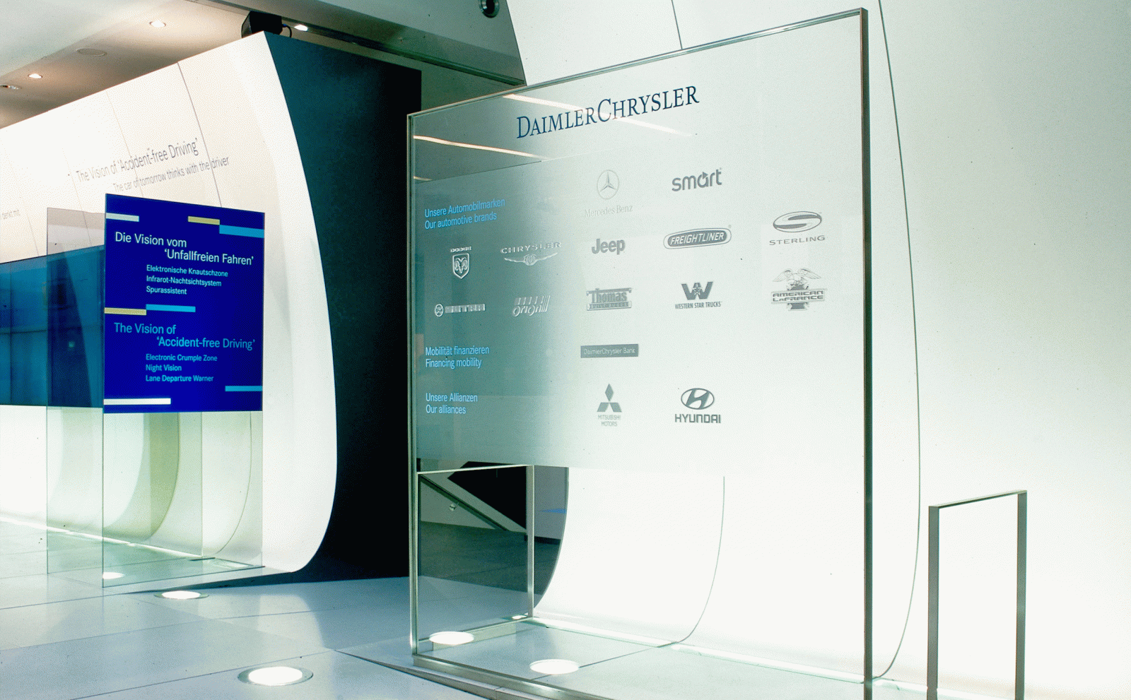 DaimlerChrysler präsentiert sich ab 2001 erstmals als «Dachmarke» auf internationalen Automobil-Messen der zu ihr gehörenden Automarken. Den Mittelpunkt der Präsentation bildet dabei der ca. 100 qm grosse thematische Schwerpunkt «Die Vision des unfallfreien Fahrens». Innerhalb des Austellungsgeländes unterstützt ein Leitsystem mit einer Übersicht über die Markenausstellungen von smart, Jeep, Chrysler und Mercedes-Benz sowie einer grafischen Kennzeichnung die Orientierung auf den Austellungsflächen des DaimlerChrysler Konzerns.