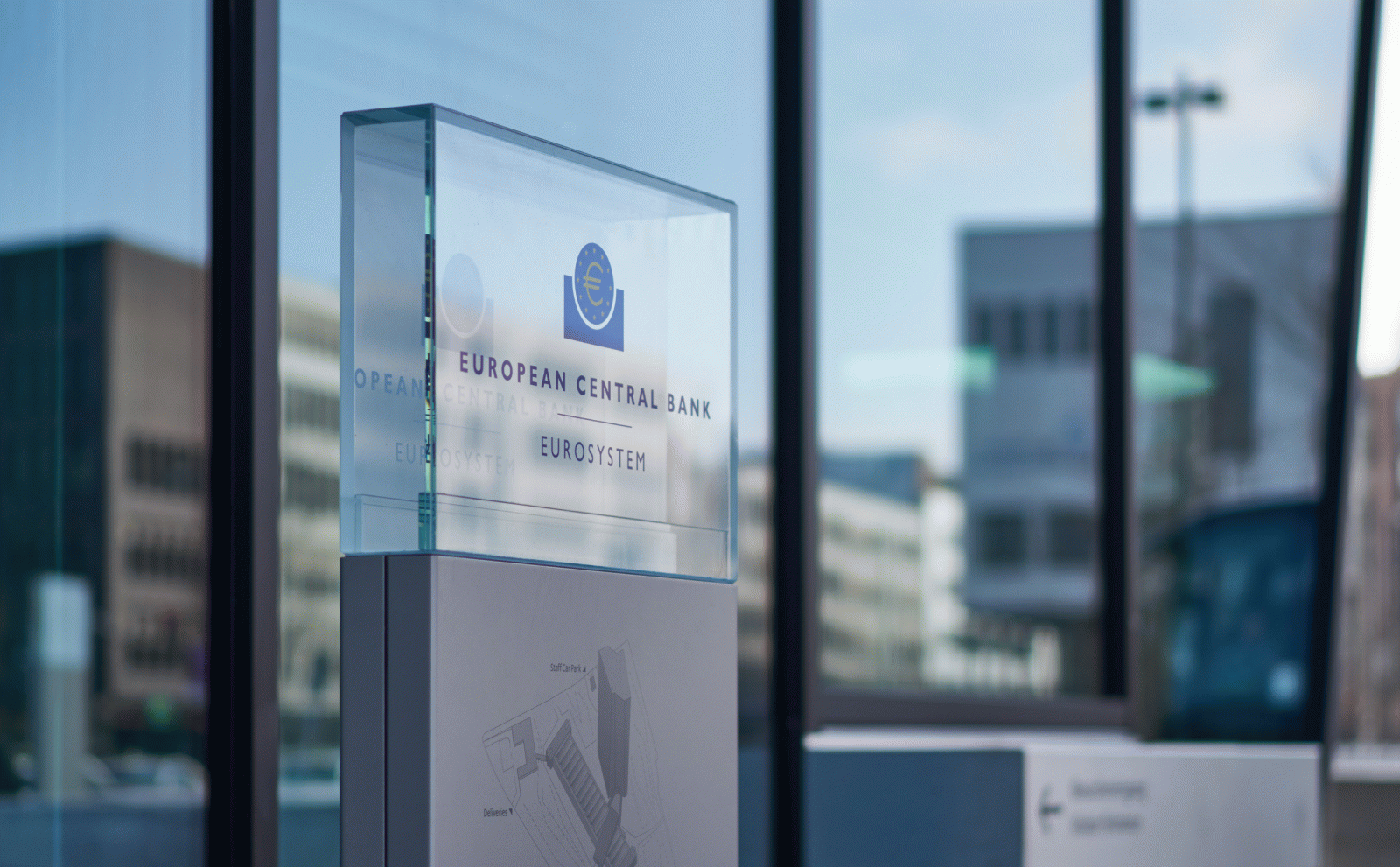 Im grossräumigen Empfangsbereich, der die alte Großmarkthalle durchschneidet, befindet sich das Logo der Europäischen Zentralbank mit allen Mitgliedern der Währungsunion.