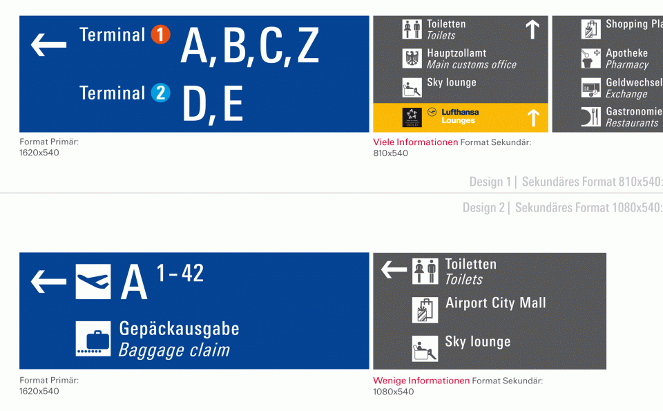 unit-design unterstützt Fraport bei der Gestaltung und Implementierung des neuen Wegeleitsystems namens pilot_plus. Subtile Verbesserungen der Lesbarkeit und der Informationsstruktur stehen im Vordergrund der Aufgabe. Der typische Charakter des Leitsystems des Frankfurter Flughafens soll für den Fluggast erlebbar bleiben. Die Projekte umfassen alle für die Orientierung notwendigen Maßnahmen; von Aufklebern bis hin zu komplexen Schildanlagen und Zollportalen mit strengen behördlichen Vorgaben.
