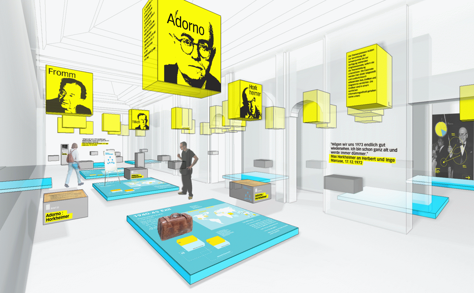 Das Jüdische Museum Frankfurt lädt unit-design zu einem Wettbewerb zur Ausstellung im Jüdischen Museum ein, die sich mit der Remigration der Protoganisten der Frankfurter Schule nach dem zweiten Weltkrieg beschäftigt. Die Ausstellung beschäftigt sich mit der Zeitgeschichte vor, während und nach dem Weltkrieg und im Speziellen mit den nationalen und transnationalen Bezügen der Protagonisten wie Max Horkheimer, Walter Benjamin, Theodor Adorno, Erich Fromm oder Friedrich Pollock, die den demokratischen Wiederaufbau aktiv mitgestalten wollten. Die Nationalsozialisten hatten das 1923 gegründete «Institut für Sozialforschung» in die Emigration getrieben. Die Stationen des Exils führten über Genf und Paris bis nach New York. Nicht alle Mitglieder überlebten; manche, wie etwa Walter Benjamin, holte der Terror auf der Flucht ein.