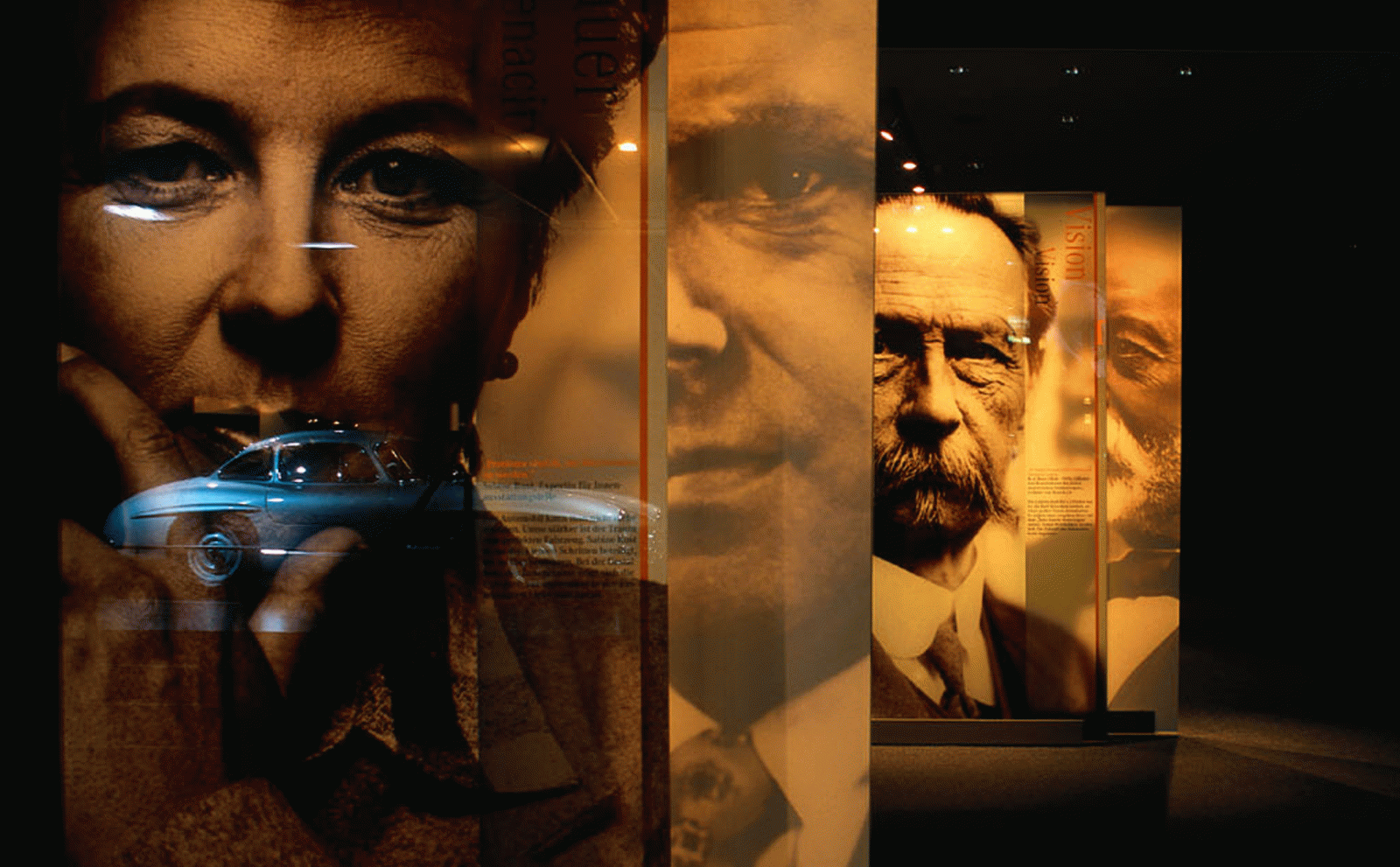 «A Story of Passion» – zum Jubiläum des Markennamens Mercedes entsteht ein Ausstellungskonzept, das die Leidenschaft für innovative Fahrzeugtechnik zum Thema hat. Wie in einer Galerie bewegt sich der Besucher zwischen raumhohen Grafikstelen, die jeweils Persönlichkeiten gewidmet sind, die das Schicksal von Mercedes-Benz beeinflusst haben. Diese überdimensionalen Portraits grosser Persönlichkeiten der Markengeschichte stehen im Dialog mit Abbildungen heutiger Mitarbeiter und deren herausragenden Leistungen für die Marke.