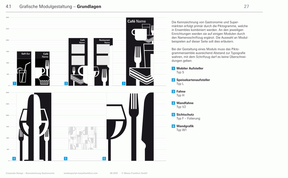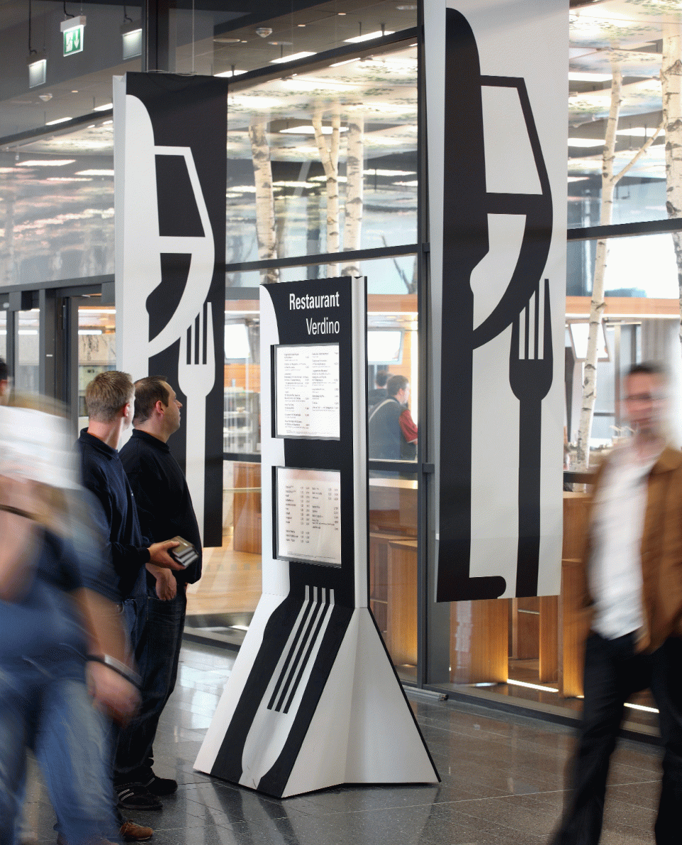 Der freie Umgang mit den Piktogrammen, die in Grösse und Erkennbarkeit an ihre Fern- und Nahwirkung angepasst sind, lässt eigenständige Grafiken entstehen. Die Kennzeichnung ist prägnant, hebt sich gerade aufgrund ihrer Klarheit und dem Hell-Dunkel-Kontrast von den restlichen Beschilderungen des Messeleitsystems ab und konkurriert dadurch nicht mit den Aufbauten der Messeaussteller. Die verwendeten Motive (Tasse, Gabel, Gläser, etc.) passen zu den jeweiligen Einrichtungen und sorgen für eine gute Unterscheidung der Gastronomiekonzepte.