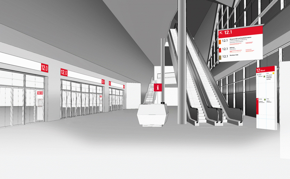 Kadawittfeldarchitekten aus Aachen gewinnen den Wettbewerb für die neue Halle 12 der Messe Frankfurt. unit-design wird mit der Entwicklung des Orientierungssystems für den Innen- und Aussenbereich beauftragt. Die Aufgabe umfasst die systemische Analyse und die Übertragung auf die Besonderheiten des Gebäudes.