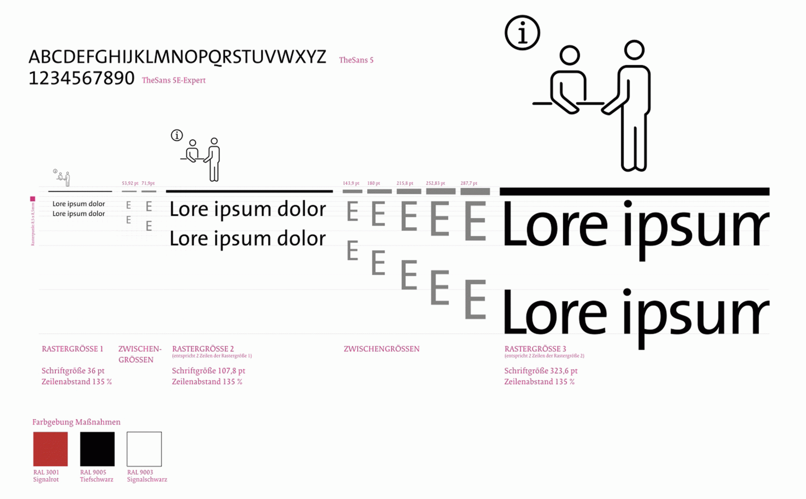 Eine auf die Farben weiss, schwarz und rot reduzierte Farbgebung in den Maßnahmen erzeugt die notwendige Deutlichkeit und Klarheit in der Beschilderung.