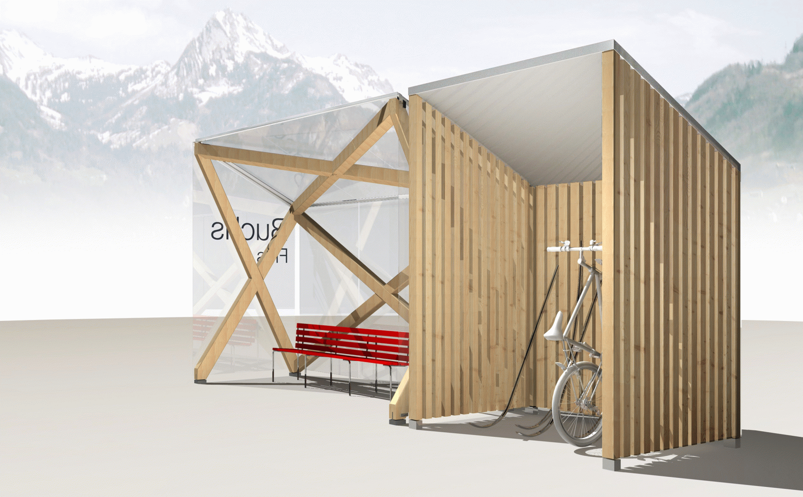 unit-design has designed a furniture system for public spaces in the Toggenburg region of Switzerland. The invitation to tender comprised various applications such as bus stops, an information system and advertising. The self-contained mixture of a wooden structure and glass panels creates a set of objects that allow interesting combinations and establish symbolic and recognizable locations within the region.