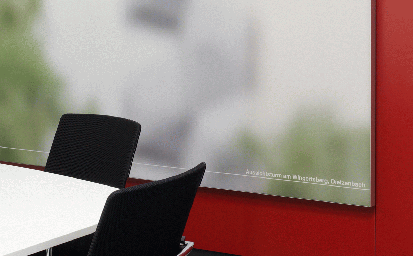The Silberturm tower is one of the most famous buildings on the Frankfurt skyline. At 166 m, it reaches 280 m above mean sea level and was Germany's tallest building for some time. Following extensive renovations to the building, Deutsche Bahn AG moved into the 32-story building in 2012 as the new main tenant. The artistic concept that unit-design created for the Silberturm established a link between each room and places in the region that are situated at the same height above mean sea level. In total, this resulted in 118 highly stylized landscape images printed in varying levels of color on the large acoustic panels in the conference rooms. "118 elevations" therefore projects views of the outside into the inside of the rooms, giving them a "window on the world". Digital distortion, blurring and abstraction lead to shifting perceptions. When viewed from close up, the images dissolve into assortments of colors, while the subjects shine through from afar.