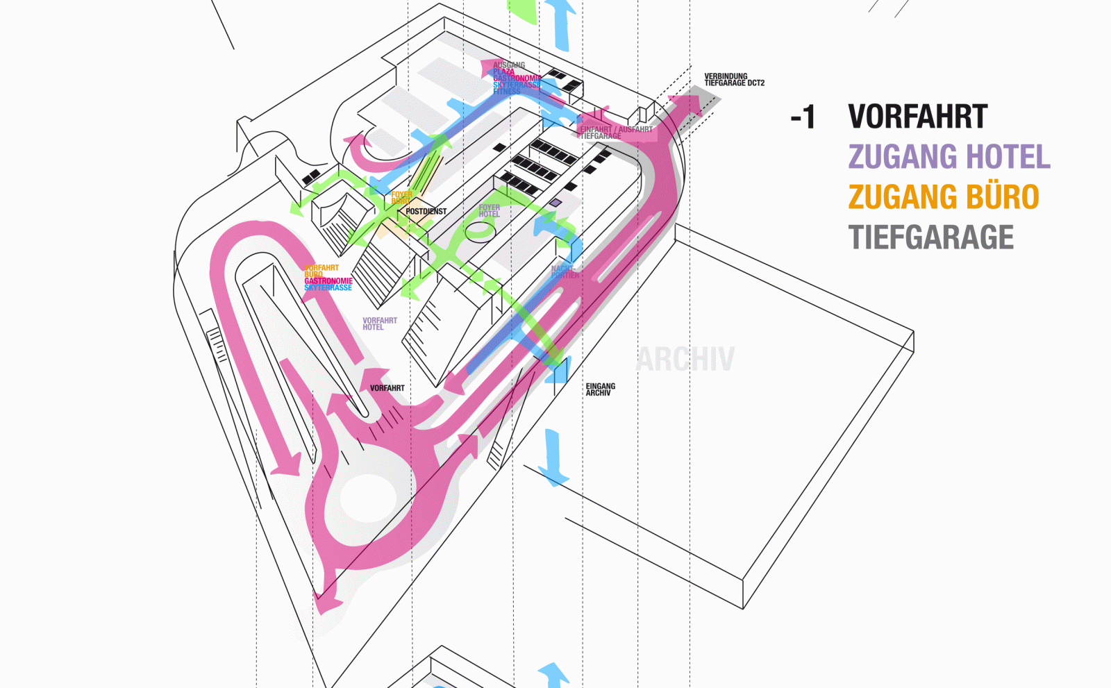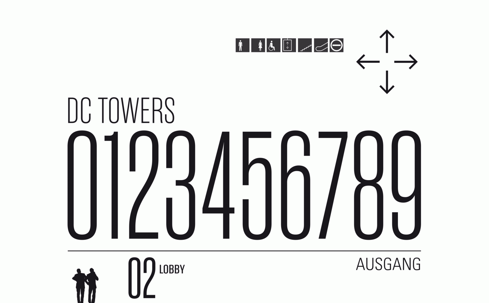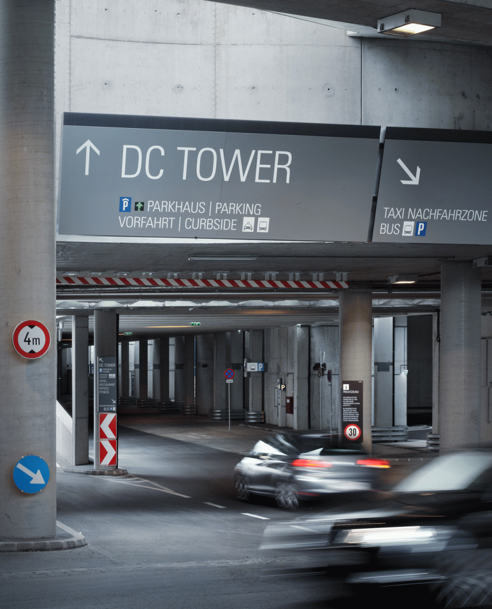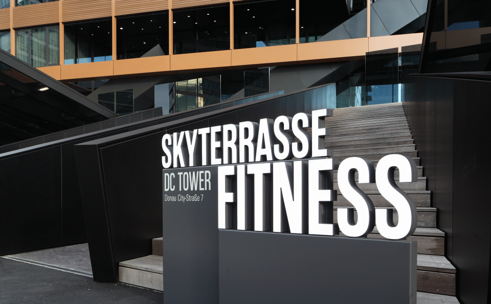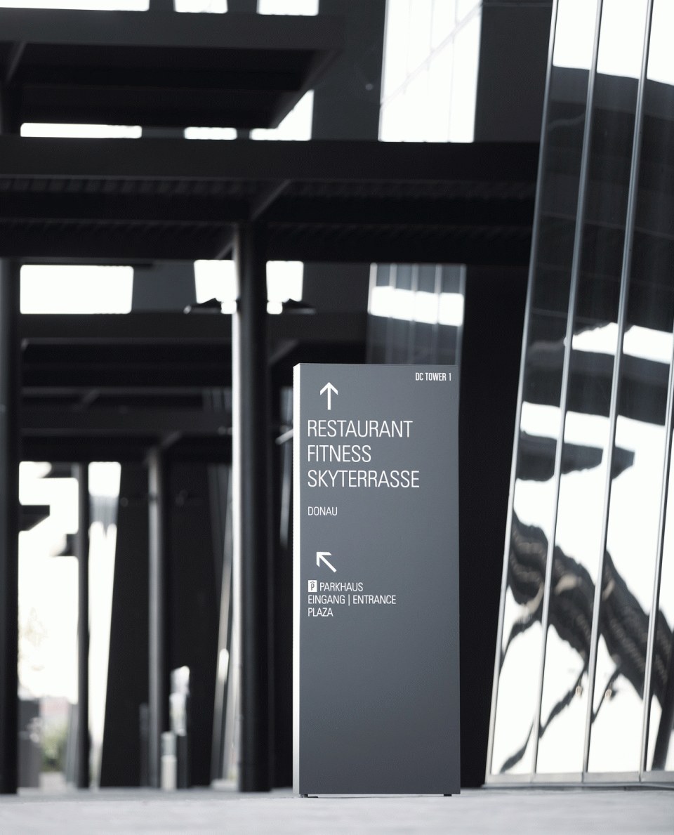 Zigzagging vertical façade strips and an elegantly proportioned structure are the central architectural elements of the skyscraper design by Dominique Perrault. They make the DC Tower a new attraction in the up-and-coming Donau City district of Vienna. The signage and guidance system designed by unit-design helps people to get their bearings around the building's 60 floors. The design concept fits seamlessly into the architecture thanks to its materials and structure. The central elements of the system are three-dimensional lettering in the outdoor areas and simple objects and spaces with lettering in the indoor areas. The signs in the indoor areas comprise high-quality, semi-matt stainless steel, while outside, pylons made from 3D contoured sheets help with orientation while simultaneously emphasizing the identity of the building.