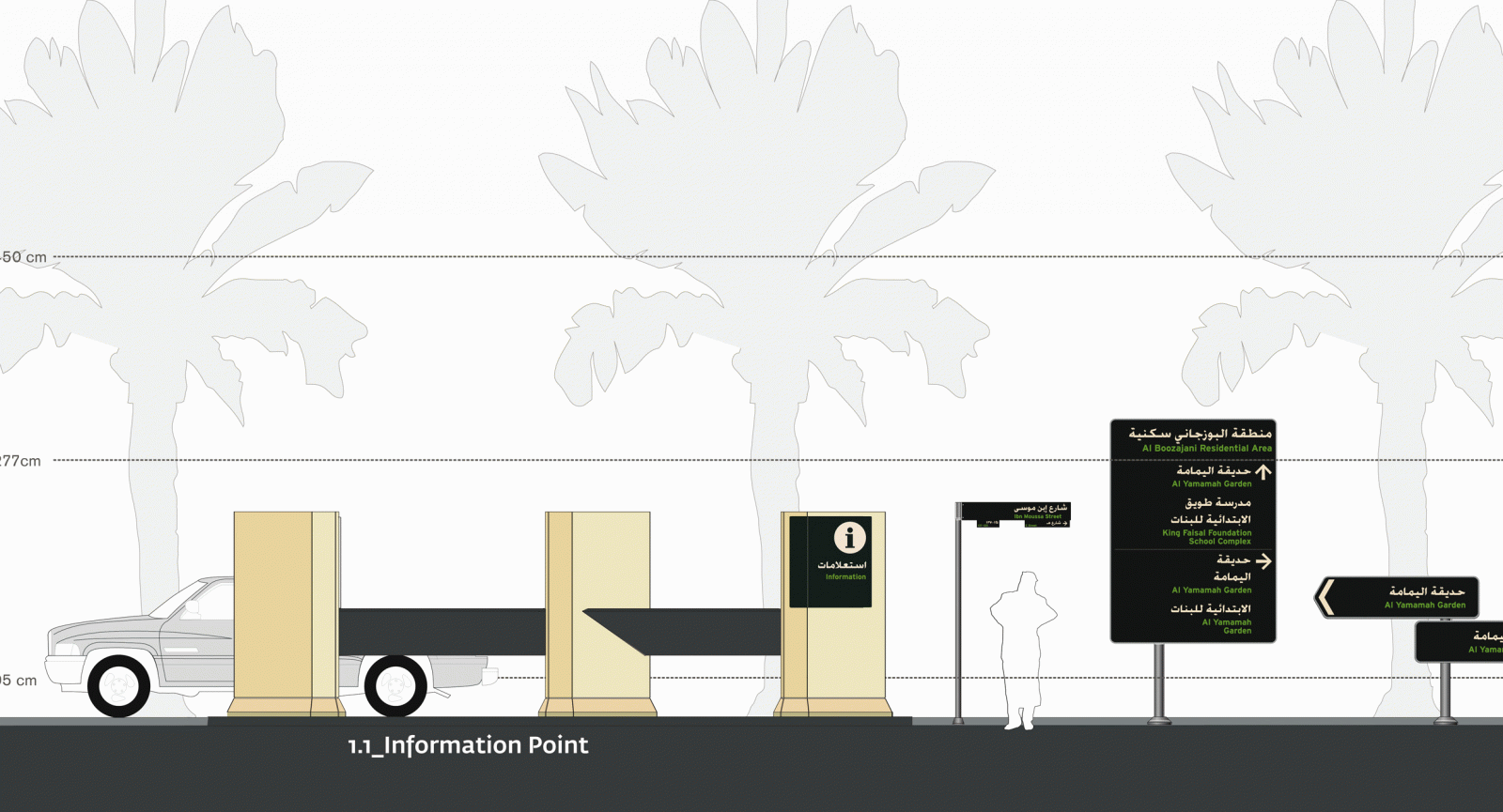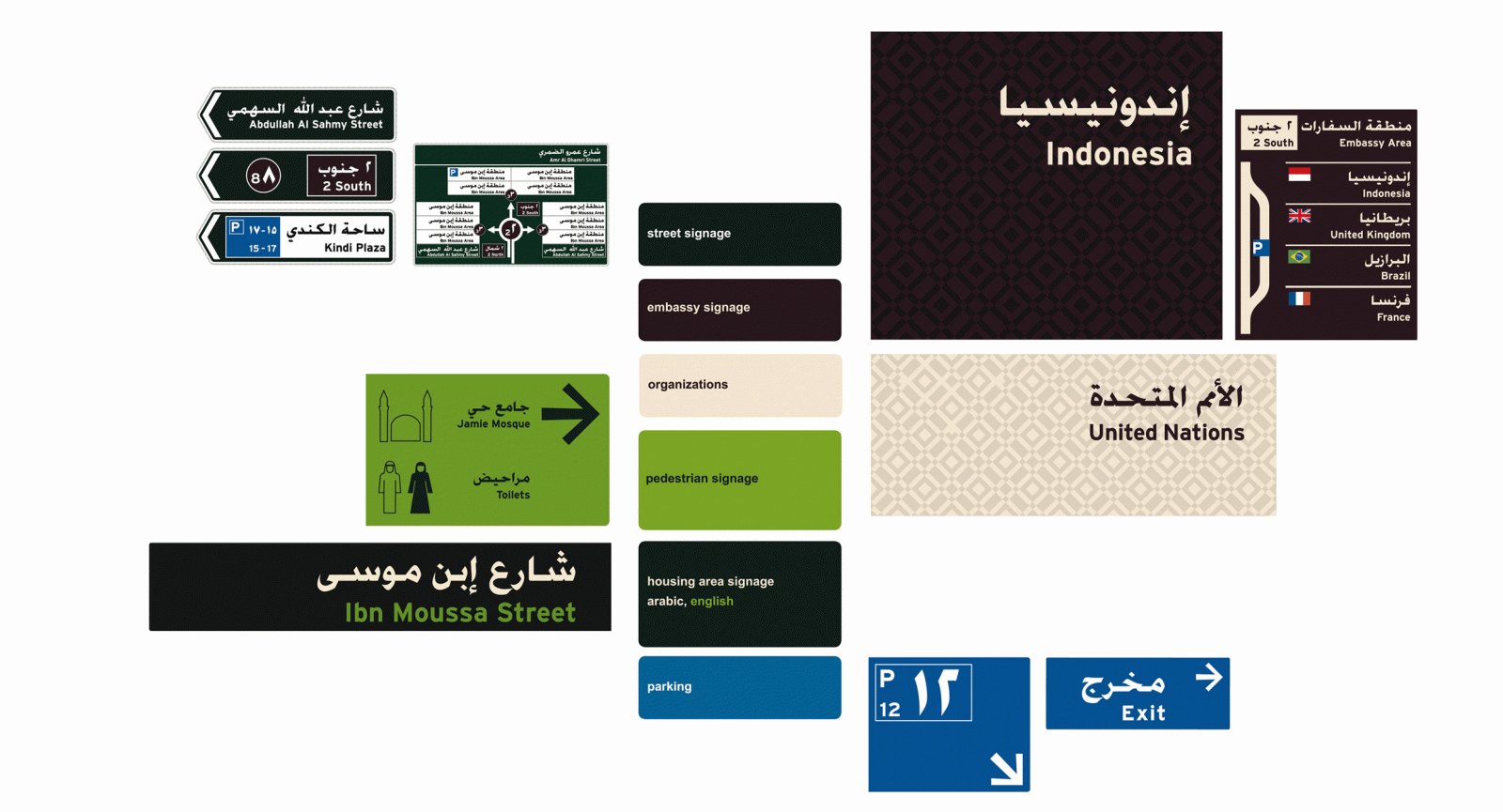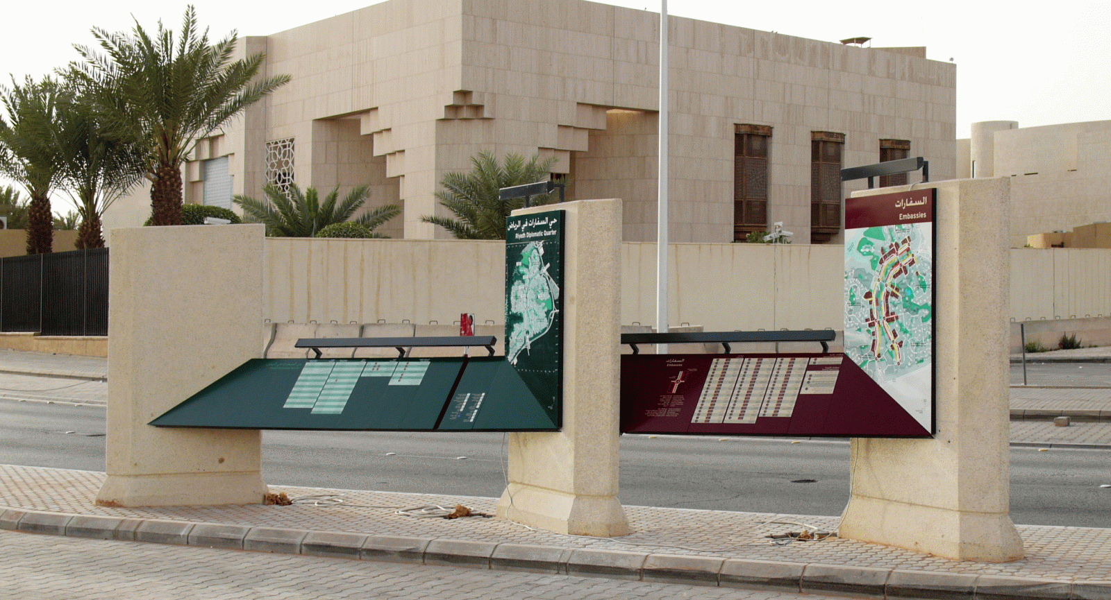 Riyadh's Diplomatic Quarter encompasses not only all foreign diplomatic missions in Saudi Arabia but also large residential areas and shopping malls. unit-design has developed a universal orientation system for visitors and residents in the new district, with a distinctive design that helps the district to have a visual identity and thereby present itself to the outside world.
