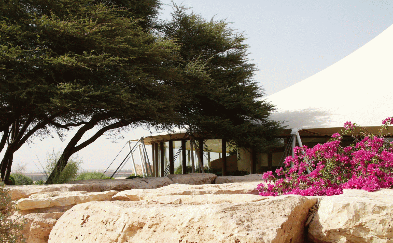 The organic design of the complex means that it appears to grow out of the surrounding desert landscape; the building, clad in sand-colored limestone, shields the lush vegetation of the large inner courtyard like a defensive wall. Landscape architect Richard Bödeker designed the green space with the recurring theme of a gradual transition from desert to garden. The distinctive tent structures by Frei Otto nestle against the building to act as roofs and shield against the sun, providing an oasis-like atmosphere with a touch of a Bedouin camp. Tuwaiq Palace is not only a hospitable oasis in the desert, but also an island of Western lifestyles in a strictly Islamic country, with its diverse complement of expats from all around the globe living there while working on local projects. Life there is not unlike a stay in a very comfortable youth hostel – aside from the odd occasions when the complex is booked by local wedding parties and the sounds of Arabic music waft through the night. This work by Frei Otto, little known in Germany, is a revelation and a curiosity – a unique architectural pearl in the desert sands.